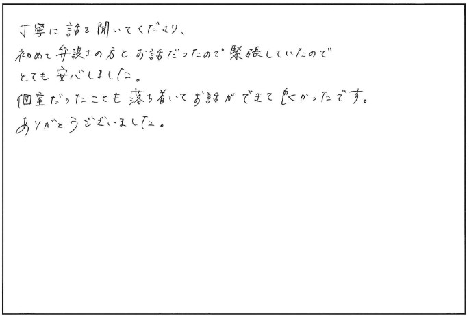 丁寧に話を聞いてくださり、初めて弁護士の方とお話しだったので緊張していたので、とても安心しました。