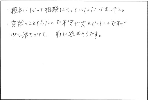 突然のことだったので不安が大きかったのですが、少し落ち着けて、前に進めそうです